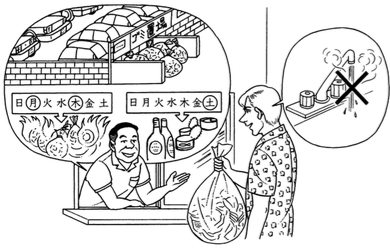 gomi okiba ha chuusha jou no yoko desu.瓶や 缶は いつですか。
