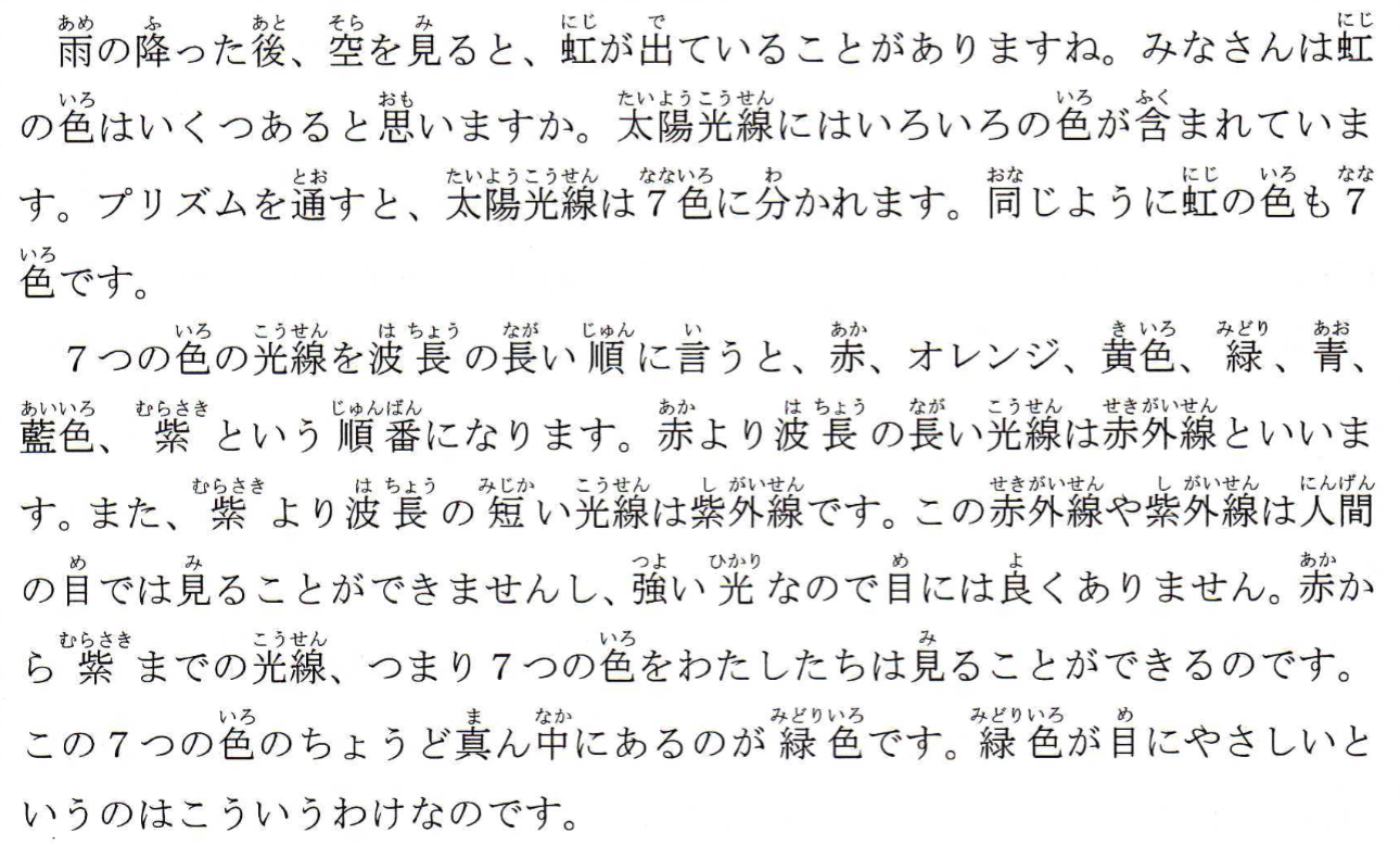 b. 虹に色の中で、一番波長の長い色は赤です。